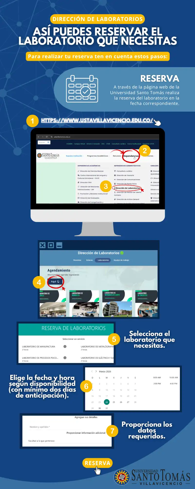 La Dirección de Laboratorios de la Universidad Santo Tomás Seccional Villavicencio se encarga de gestionar y proyectar el funcionamiento y los servicios de laboratorio para el desarrollo de las prácticas y pruebas de los diferentes programas académicos de la Universidad Santo Tomás - Villavicencio y ofrecer un portafolio de servicios a la sociedad.